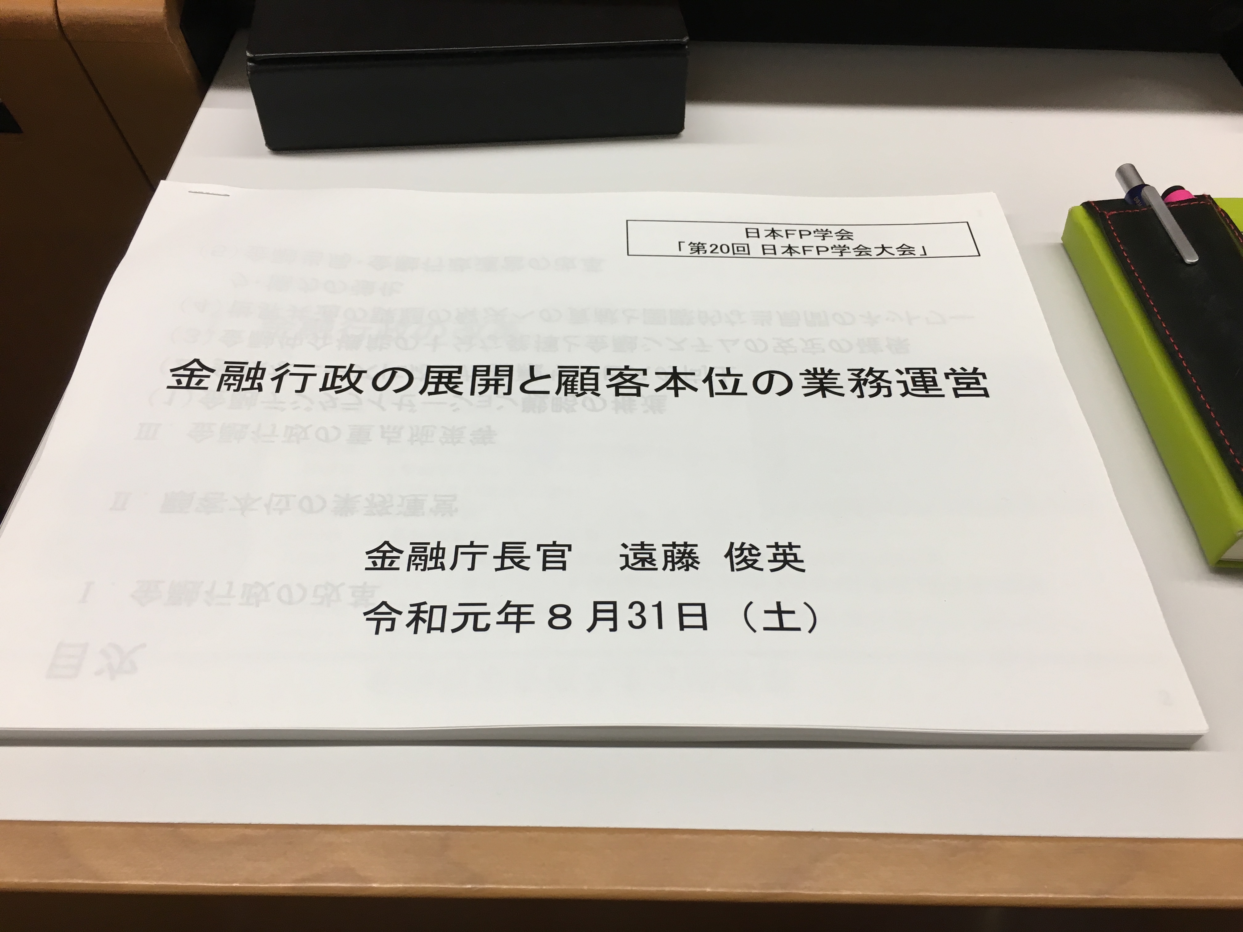 金融庁長官・遠藤俊英氏「金融行政の展開と顧客本位の業務運営」 2019.09.02 FP FP協会セミナー 先日8月31日に日本FP協会主催、金融庁長官の遠藤俊英氏講演「金融行政の展開と顧客本位の業務運営」に参加してきました。 講演では金融システム安定化の取組み、フィンテック、教育についての方向性が示されていました。 まとめようかと思いましたが、120ページも資料があり断念。 いつでも見られるよう、PDF化&ファイリングだけしました。 またご来店いただいた時にご要望があればお見せいたします。 以前の記事 新しい記事 関連記事 日経セミナー「人生100年時代、変革する金融サービス」 日経セミナー「人生100年時代、変革する金融サービス」 自分だけは損したくない人の心理学 自分だけは損したくない人の心理学 2019年度FPフェアin大阪 2019年度FPフェアin大阪 日本FP協会「投資助言・代理業としてのFPビジネス」 日本FP協会「投資助言・代理業としてのFPビジネス」 初回相談無料 メールは24時間受付!まずはご相談下さい。 営業時間:月・火・木・金・土 10:00-18:00 お気軽にご相談ください!お問い合わせはこちら